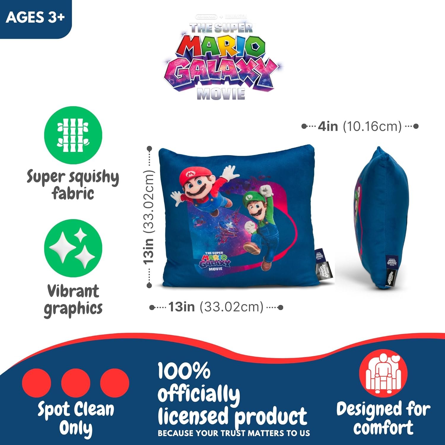 - Is this officially licensed and safe for kids? Yes, the Mario pillow is a 100% officially licensed Nintendo product, meeting safety standards for children ages 3 and up.