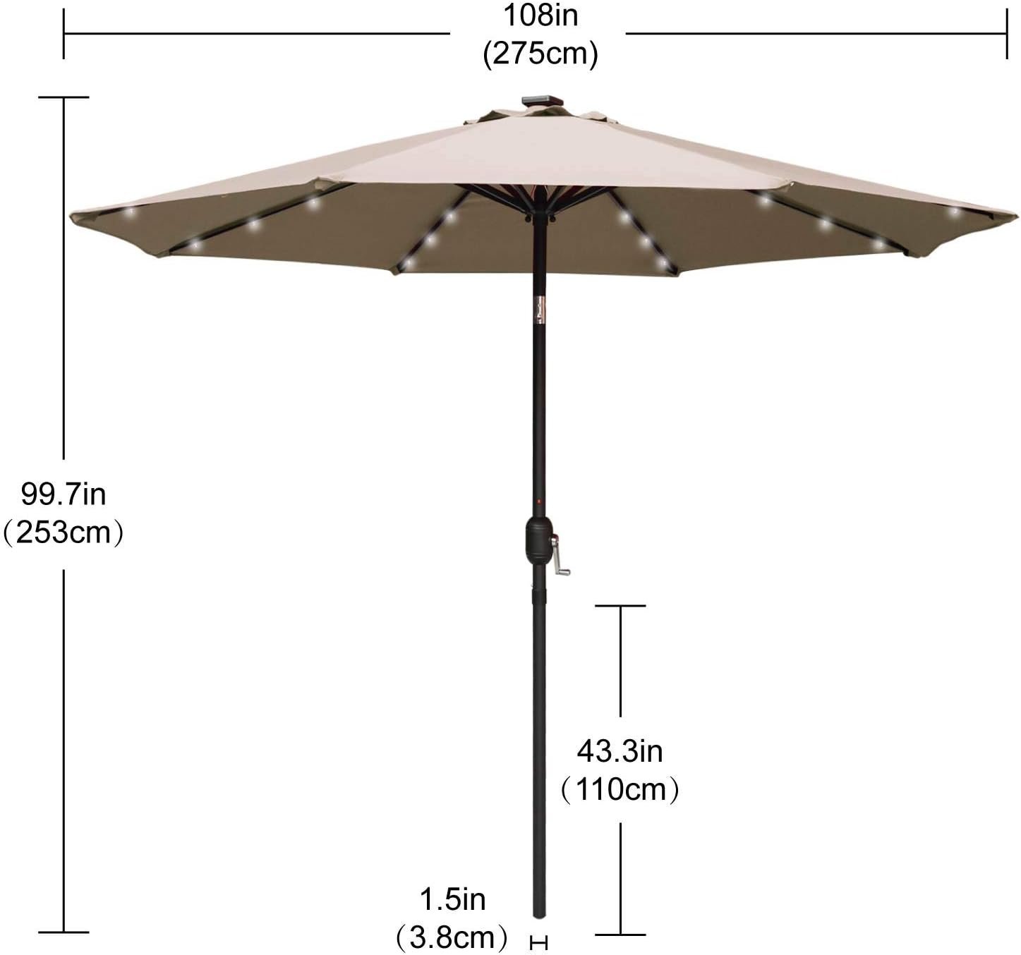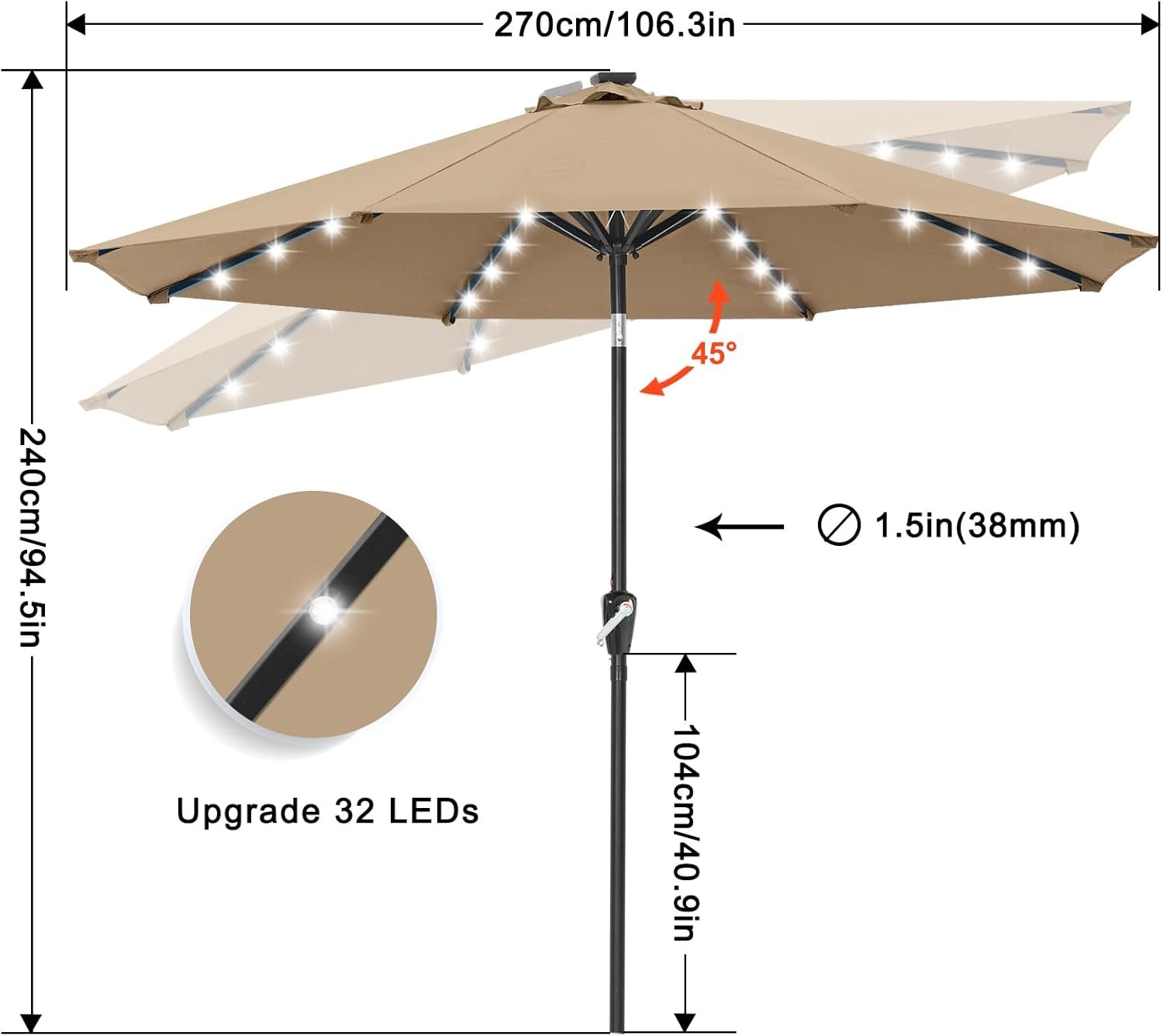 The ABCCANOPY Durable Solar LED Patio Umbrella (9FT, khaki) is the perfect addition to any outdoor setup, featuring 32 energy-efficient LED lights powered by a solar panel for evening ambience. Designed for durability, it withstands winds up to 36 mph with a sturdy, anti-rust steel frame and 8 heavy-duty ribs. The quick crank lift and push-button tilt ensure easy operation and optimal shade, while the UPF 50+ yarn-dyed fabric offers superior UV protection. Ideal for patio tables with 4 to 6 chairs, this umbrella transforms your patio, deck, or pool into a stylish and comfortable retreat.